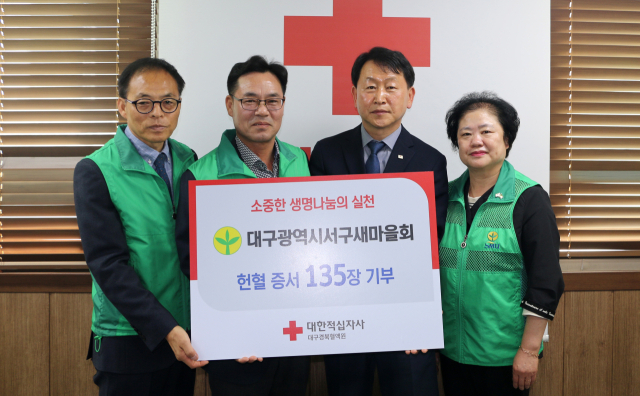 대구 서구 새마을회(회장 김동근)는 2일 대한적십자사 대구경북혈액 (원장 이건문)에 수혈이 필요한 어려운 분들을 위해 써달라며 헌혈증서 135매를 기부했다.