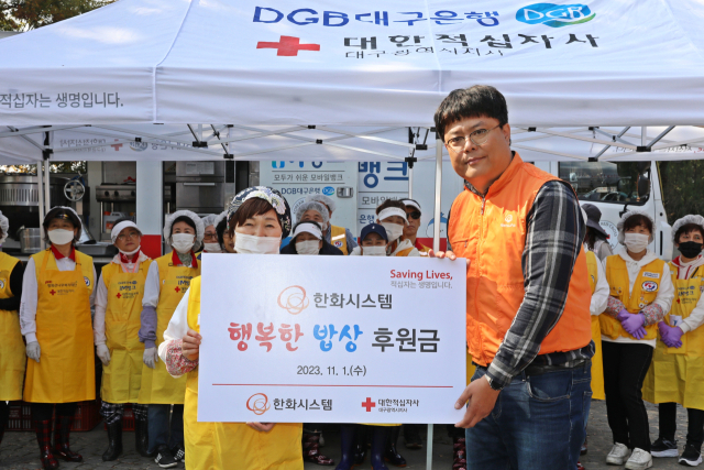 한화시스템 구미사업장(사업장장 양태호)은 대한적십자사 대구시지사(회장 박명수)와 함께, 1일 두류공원에서 취약계층 어르신 1,000여 명을 위한 행복한 밥상(무료급식) 활동을 실시했다.