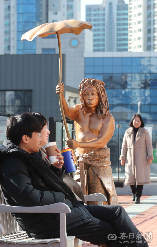 28일 대구 달서선사관 테라스 의자 옆에 연잎 우산을 든 선사인 조형물이 놓여 눈길을 끈다. 달서구는 선사시대 관광인프라 구축을 위해 유천동 행정복지센터 인근에 '선사시대로(路) 테마거리' 2단계 조성 사업을 최근 완료했다. 정운철 기자 woon@imaeil.com