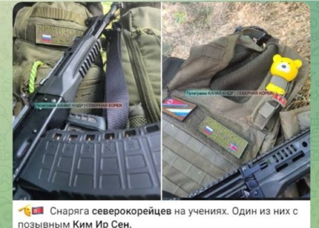 공개된 사진에는 러시아 국기와 북한 인공기가 부착된 군복에 '김일성'이라는 글자가 새겨져 있고, 그 위에 소총이 올려져 있다. 이 채널은 "이들(북한군)에게 러시아제 AK-12소총이 지급된 것으로 추정되며 탄창에는 5.45mm 구경의 실탄이 보인다"고 전했다.