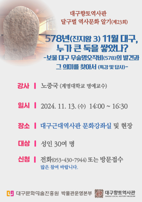 이번 특강에서는 비문 내용과 그 의미에 대해 살펴보며, 강의 후에는 1946년 무술명오작비가 발견된 중구 대안동 현장을 직접 찾아본다.