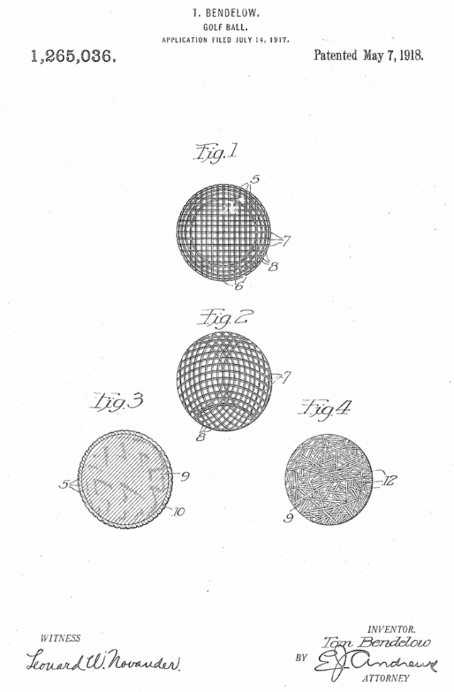 첫째, 골프공 딤플 구조와 탄성 복원에 대한 설계(Bendelow, Tom. "Golf-ball." U.S. Patent No. 1,265,036. 7 May 1918년). 이 특허기술은 딤플 설계의 필요성과 골프공의 코어와 외피의 다층 설계는 공기저항을 최소화하고 비거리를 최대화하기 위해 20세기 초 개발된 기술이다.