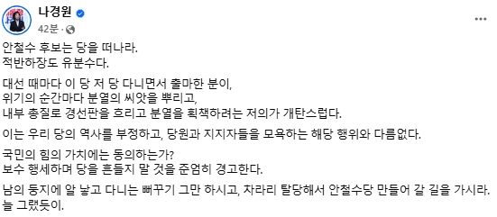 이어 "국민의 힘의 가치에는 동의하는가?"라고 물으면서 "보수 행세하며 당을 흔들지 말 것을 준엄히 경고한다. 남의 둥지에 알 낳고 다니는 뻐꾸기 그만 하시고, 차라리 탈당해서 안철수당 만들어 갈 길을 가시라. 늘 그랬듯이"라고 요구했다.