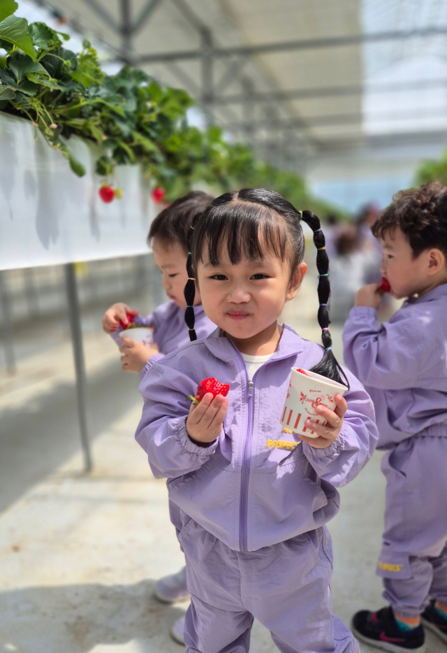 경북전문대학교에서 위탁 운영하는 봉화군 어린이급식관리지원센터는 지난 21일과 23일 오는 25일 28일 4일간 관내 어린이집 10개소 원생 200명(2세부터 6세까지)을 대상으로 봉화읍 적덕리 '폴인베리 농장'에서 딸기 따기 체험을 진행 중이다.