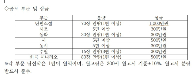 -원고 첫 장에 별도로 응모 부문과 주소, 본명, 나이, 연락처를 반드시 기입해야 합니다. 특히 나이를 허위로 작성할 경우 불이익이 있을 수 있습니다.