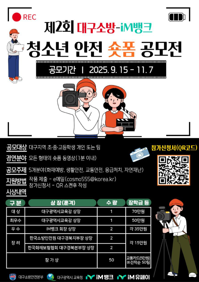 iM뱅크(아이엠뱅크)와 대구소방안전본부가 대구지역 초·중·고등학생을 대상으로 '제2회 청소년 안전 숏폼 공모전'을 개최한다.