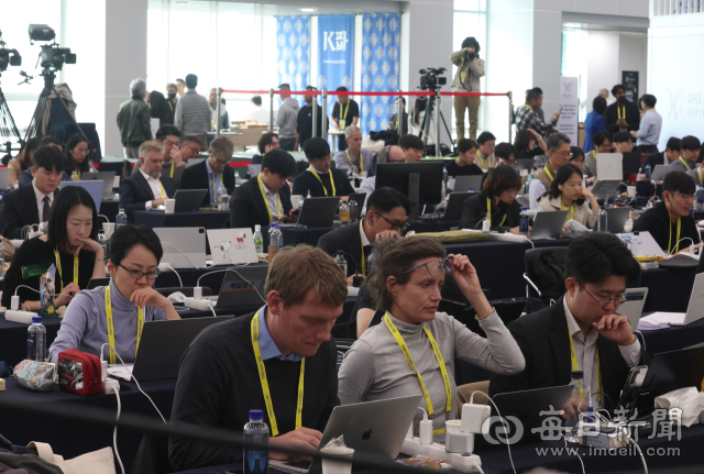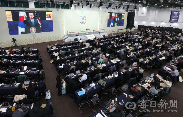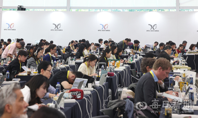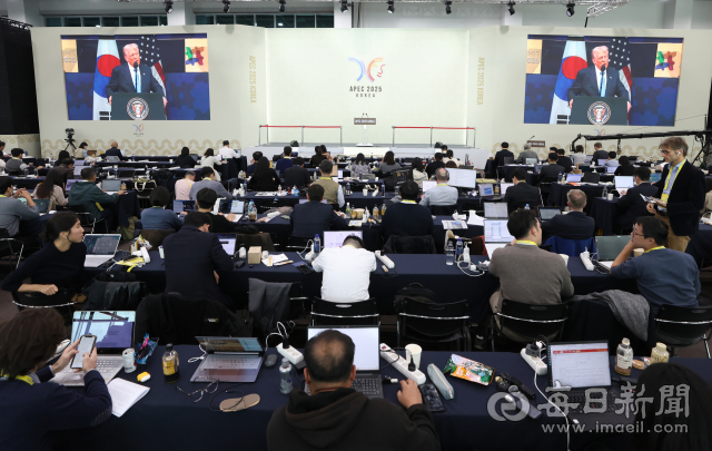 29일 경주화백컨벤션센터 내 마련된 국제미디어센터(IMC)에서 내외신 기자들이 도널드 트럼프 미국 대통령의 APEC CEO 서밋 특별 연설을 취재하고 있다. 안성완 기자 asw0727@imaeil.comm