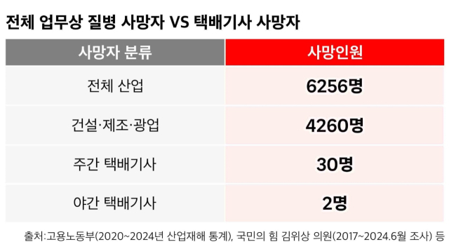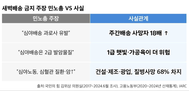최근 민주노총이 "죽음의 심야노동을 멈춰야 한다"고 성명을 반복할 때마다 여론에서는 "건설업과 제조업 산재 사망자가 훨씬 많다", "야간에 더 많은 택배기사가 과로사한다는 근거가 있느냐"는 반응이 이어진다.