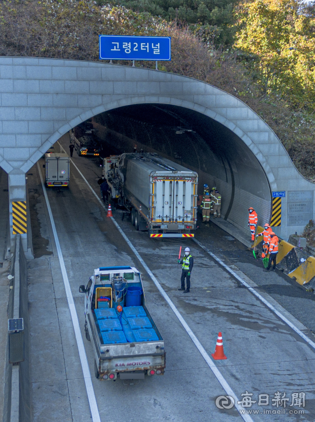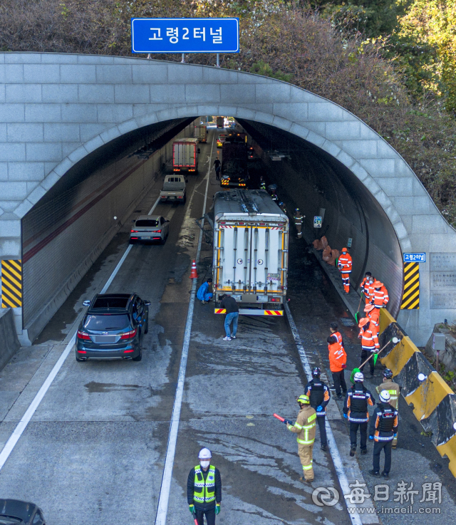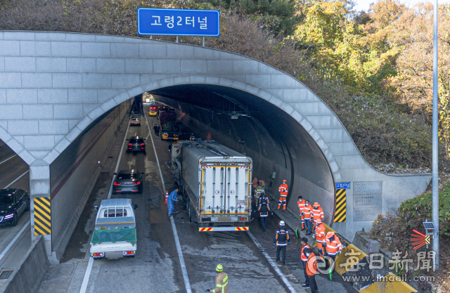 18일 오후 1시 4분 쯤 중부내륙고속도로 양평방향 경북 고령군 고령2터널에서 화물차 3대가 잇따라 추돌해 화재가 발생, 소방당국이 진화 작업을 벌이고 있다. 이 사고로 1명이 숨지고 1명이 다쳤다. 안성완 기자 asw0727@imaeil.com