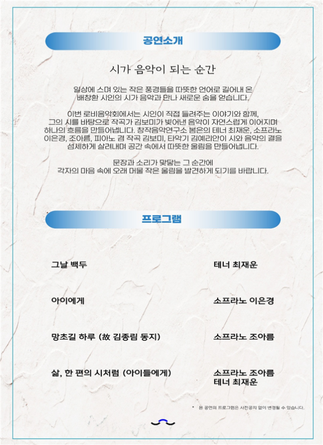배창환 시인의 시 4편을 김보미 작곡가의 창작 가곡으로 선보여