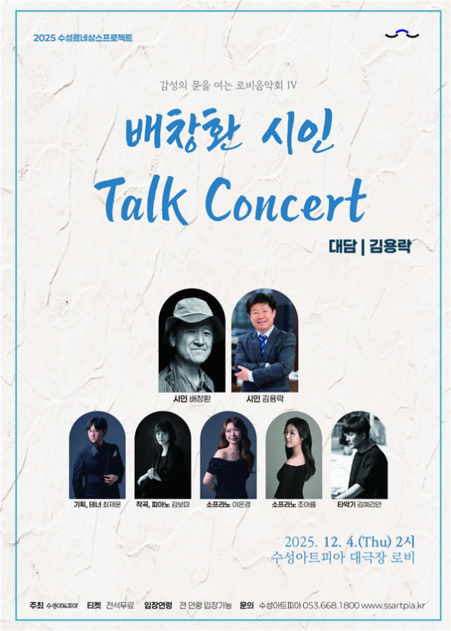 수성아트피아는 '2025 수성르네상스프로젝트'의 일환으로 진행되는 '감성의 문을 여는 로비음악회 Ⅳ'에서 배창환 시인의 창작 가곡 토크 콘서트를 오는 12월 4일(목) 오후 2시, 대극장 로비에서 개최한다.
