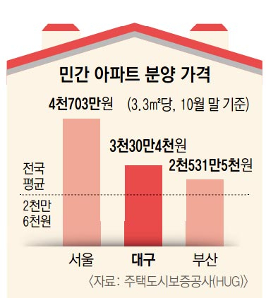 ※그래픽=서울, 대구, 부산 민간 아파트 분양가격(3.3㎡당, 10월 말 기준)