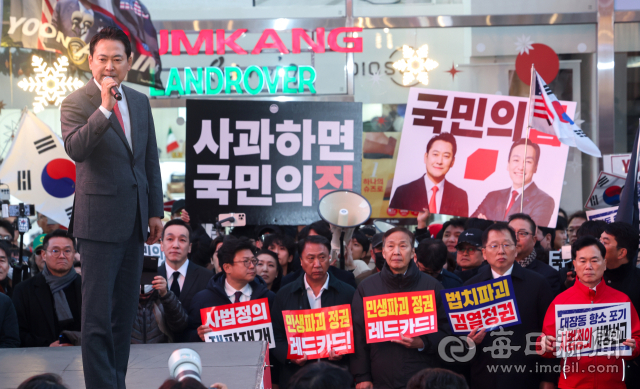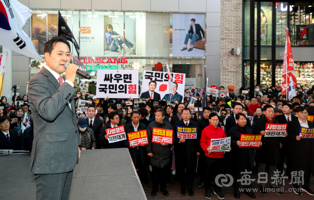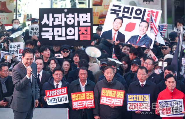 장동혁 국민의힘 대표가 28일 오후 대구 중구 동성로에서 열린 '민생회복 법치수호 대구 국민대회'에서 연설하고 있다. 안성완 기자 asw0727@imaeil.com
