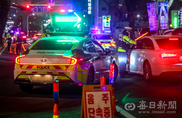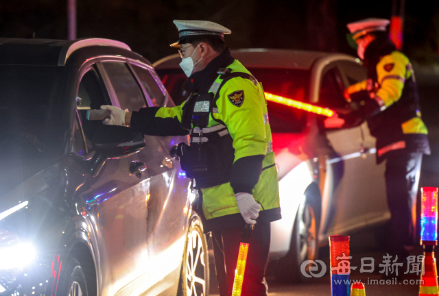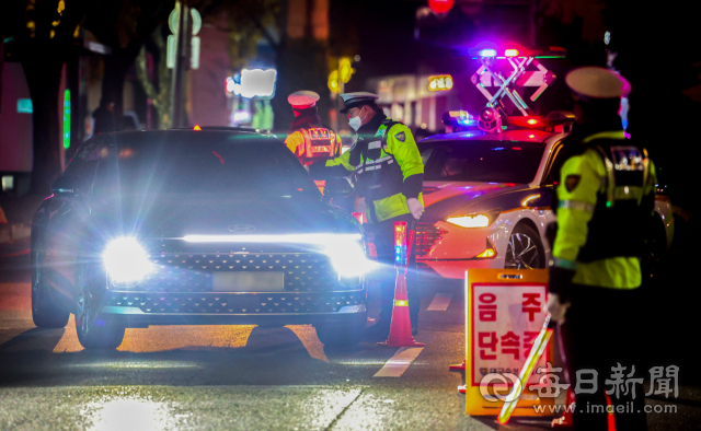 29일밤 대구 수성구 한 도로에서 경찰이 음주단속을 하고 있다. 대구경찰청은 연말연시를 맞아 유흥가 밀집 지역과 음주운전 사고 다발 지역 등을 중심으로 밤낮없이 불시 단속할 계획이다. 안성완 기자 asw0727@imaeil.com