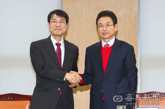 20일 경상북도청에서 열린 '대구·경북 행정통합 추진 협의 회의'에서 이철우(오른쪽) 경북도지사와 김정기 대구시장 권한대행이 악수하고 있다. 안성완 기자 asw0727@imaeil.com