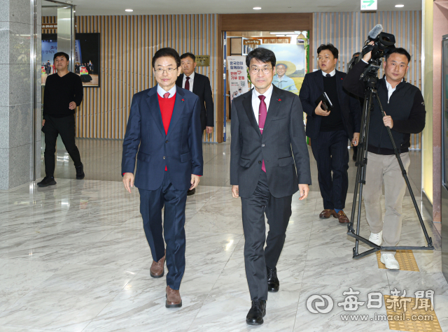 20일 경상북도청에서 열린 '대구·경북 행정통합 추진 협의 회의'에 참석하기 위해 이철우 경북도지사와 김정기 대구시장 권한대행이 이동하고 있다. 안성완 기자 asw0727@imaeil.com