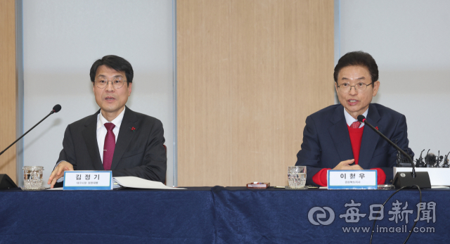 20일 경상북도청에서 열린 '대구·경북 행정통합 추진 협의 회의'에서 이철우(오른쪽) 경북도지사와 김정기 대구시장 권한대행이 인사말을 하고 있다. 안성완 기자 asw0727@imaeil.com