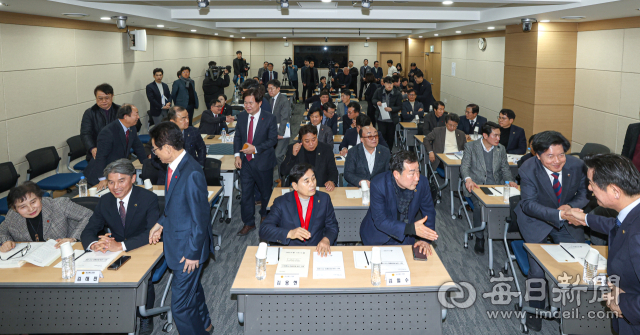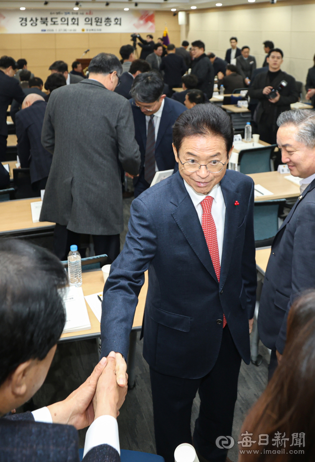 대구·경북(TK) 행정통합 논의가 급물살을 타고 있는 27일 경북도의회에서 열린 '경상북도의회 의원총회'에 참석한 이철우 경북도지사가 도의원들과 인사를 나누고 있다. 안성완 기자 asw0727@imaeil.com