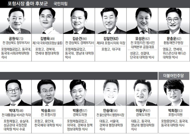 포항시장 선거 열기가 뜨겁다. 이강덕 시장의 3선 제한으로 '무주공산'이 되자, 보수 텃밭인 이곳에선 "공천이 곧 당선"이라는 기대 속에 10여명이 난립해 치열한 예선전을 예고하고 있다. 후보군은 경제·행정 전문가부터 40~70대까지 다양해 남다른 차별성이 승패를 가를 전망이다.