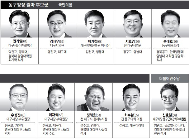 동구청장 선거는 다양한 커리어를 자랑하는 도전자들 간 누가 경선 진출의 유리한 고지를 밟나에 모아지고 있다. 전직 구청장과 전·현직 시의원, 대구시 경제부시장, 기업인 출신 등이 선거전에 뛰어들었다.