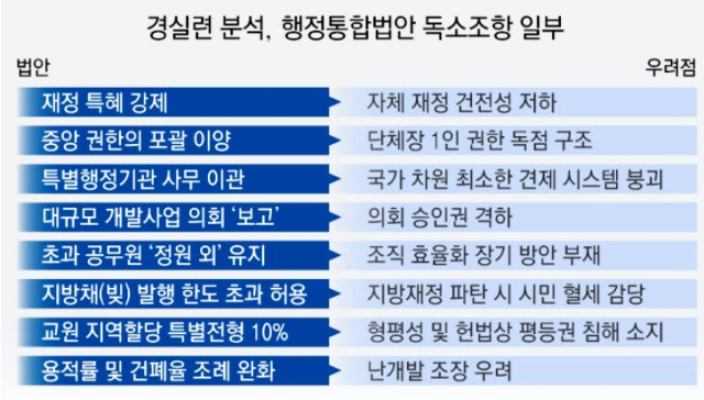경실련은 이들 법안이 "단체장 1인에게 권한을 집중시키는 구조"라고 지적하며, 특별지방행정기관의 권한과 사무를 통합특별시에 이관하도록 규정한 조문에 대해 "민주적 견제 기능을 약화하는 구조"라고 분석했다.