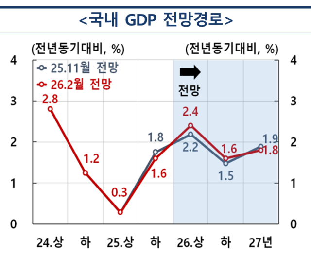 한은은 같은 날 '수정 경제전망' 자료를 내고 올해 실질 국내총생산(GDP) 성장률을 2.0%로 전망했다. 지난해 11월 제시한 전망치 1.8%에서 0.2%p 올려잡은 것이다. 이는 한국개발연구원(KDI)과 국제통화기금(IMF) 전망치 1.9%보다 높고, 경제협력개발기구(OECD)가 제시한 2.2%보다는 낮은 수준이다.