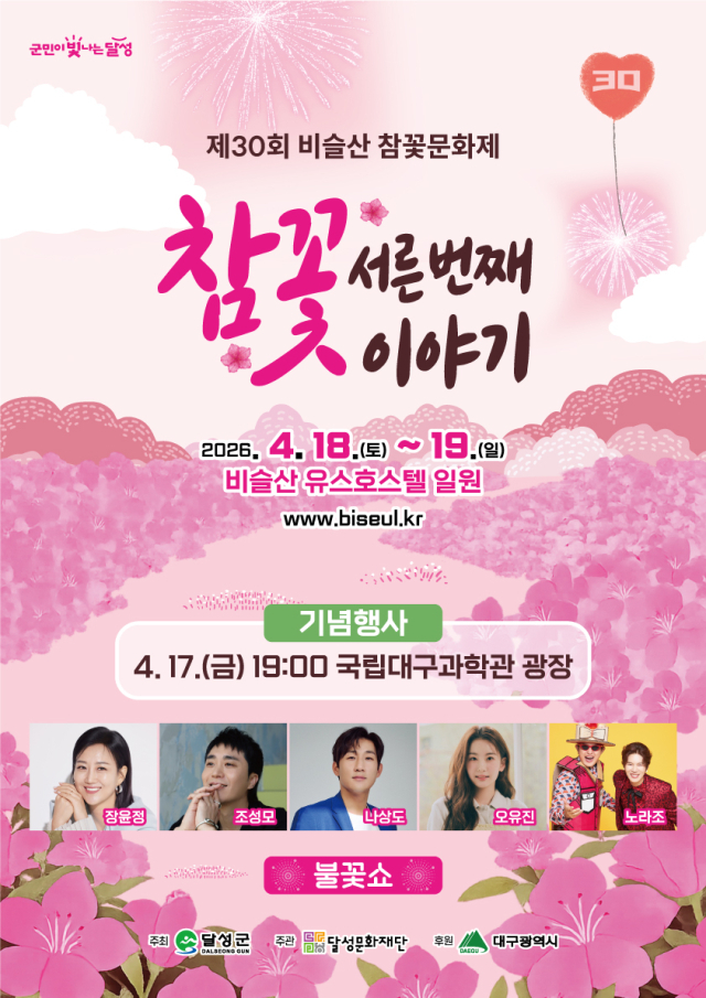 (재)달성문화재단은 대구 달성군을 대표하는 봄 축제인 '제30회 비슬산 참꽃문화제'를 오는 4월 17일부터 19일까지 국립대구과학관 광장과 비슬산 유스호스텔 일원에서 개최한다.